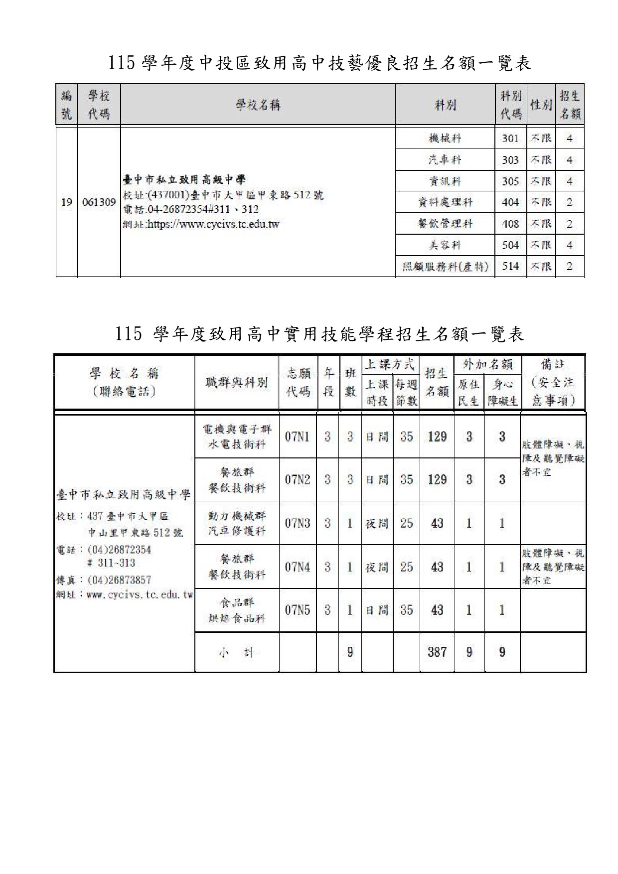 致用高中115學年度招生重要日程及招生方式